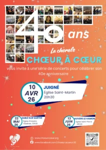 Chœur à Cœur c’est une chorale d’une quarantaine de chanteurs amateurs des environs d’Auvers le Hamon dans la Sarthe (72), qui n’aiment rien tant que chanter. La chorale se réunit chaque semaine pour chanter un répertoire varié, comprenant de la musique du monde, sacrée, classique… Mais encore bien d’autres … Des plus doux aux plus entraînants. En français, anglais, italien, zoulou…